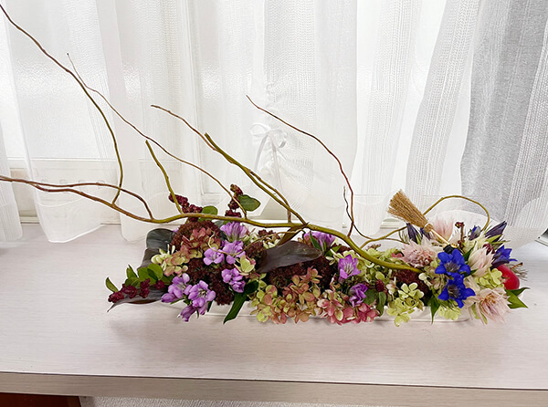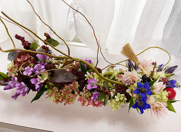 秋色のアジサイや、ドラセナ。素敵な色味のリンドウを2色。ドラゴン柳が秋枯れのうら寂しい雰囲気を出してくれています。