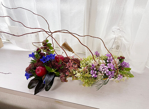一本のほうきでさりげないハロウィンを演出小さなカボチャのオーナメントもいます。フラワーアレンジメントで季節の行事を表現するというのは、アレンジメントの王道の楽しみ方です。
