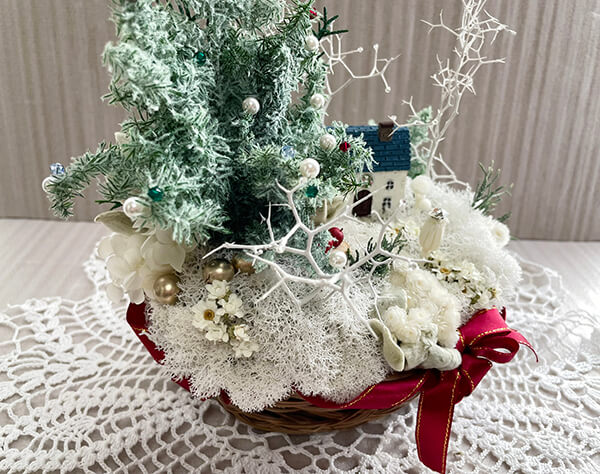 フラワーアレンジメント クリスマスツリー, ジオラマ風, プリザーブドフラワー, 箱庭風, 雪景色