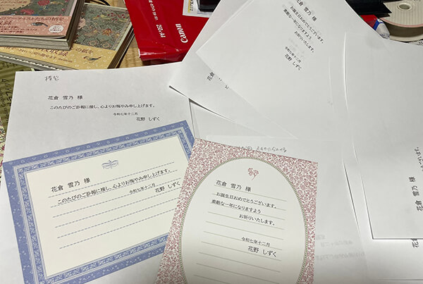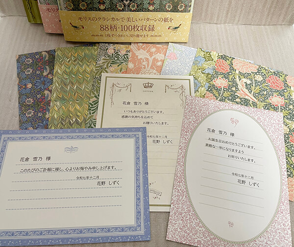 一枚一枚お客様の名前を印刷するのですが、裏張りしたりインクシミができて何度も印刷し直したりと、とにかく別の方法をと検討した結果、小型便箋に変更する事にしました。